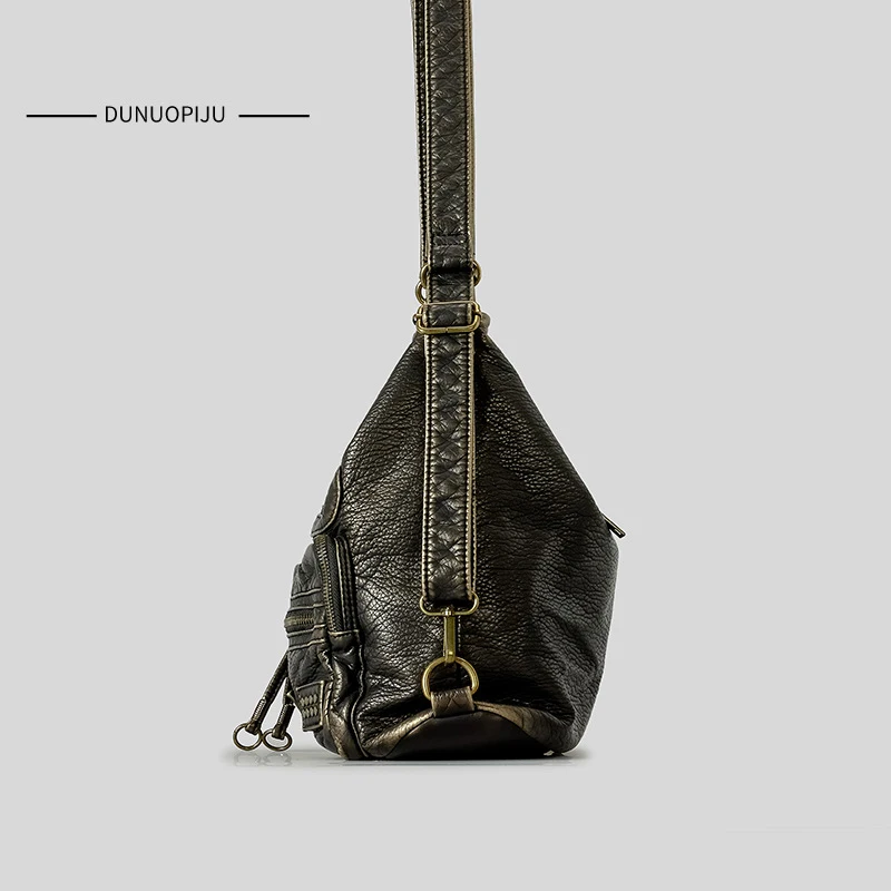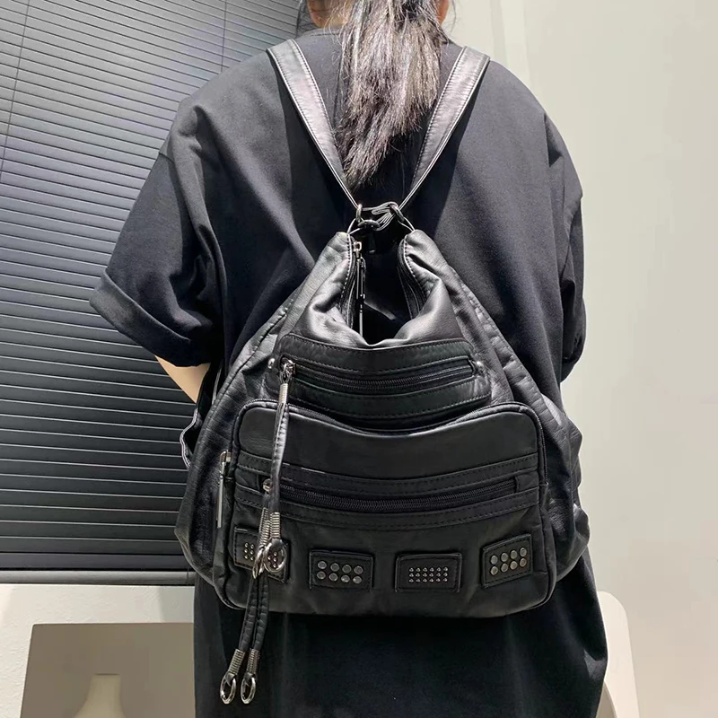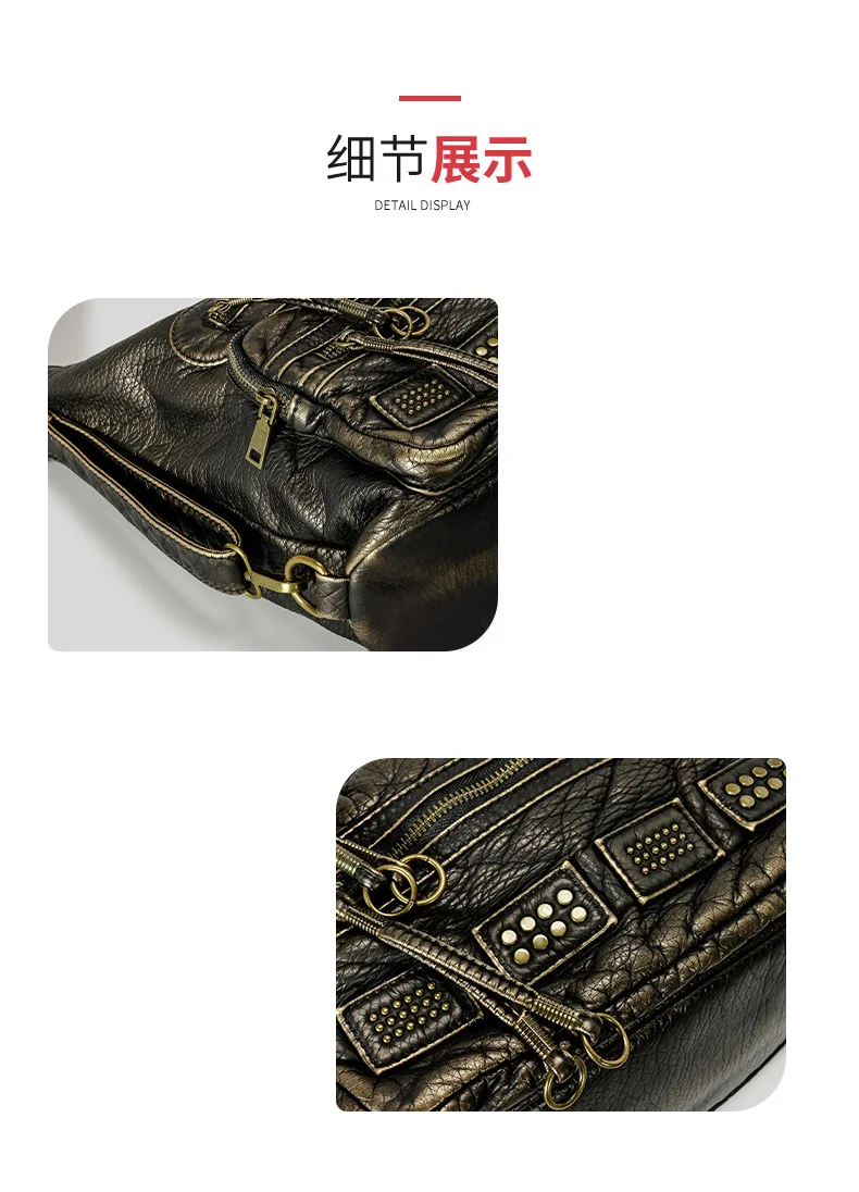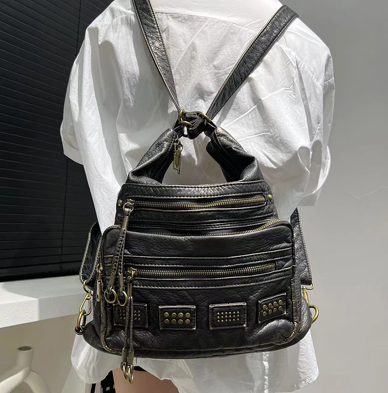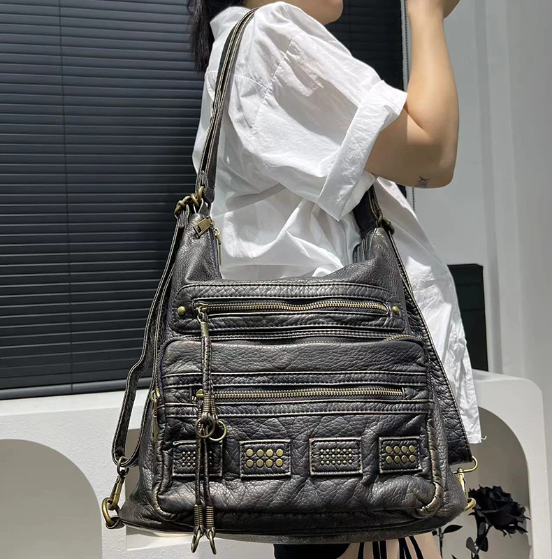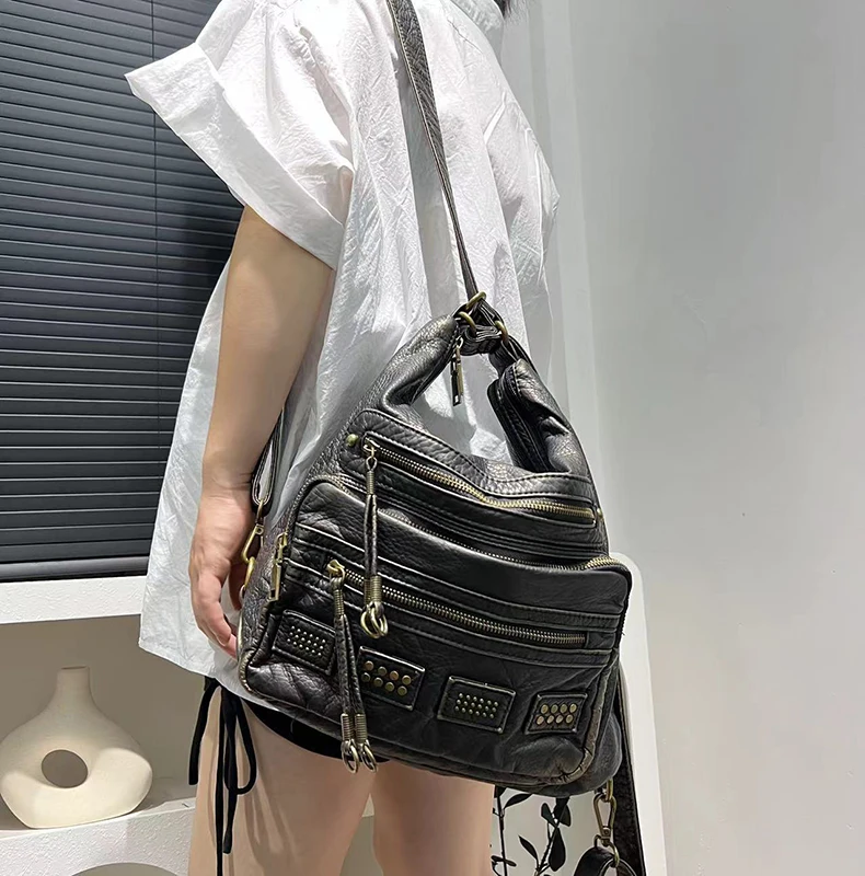 Y2K Women’s Bag Fashion Retro Rivet Tote Bag Water Washed Soft Leather Large Capacity Commuter Single Shoulder Crossbody Bag